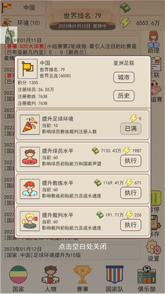 1、在國家界面下,我們可以隨心所欲的對一系列數(shù)據(jù)進行提升操作,包括了:足球環(huán)境、球員水平等等,我們可以自由點擊提升,看看右上角是無限體力喲。